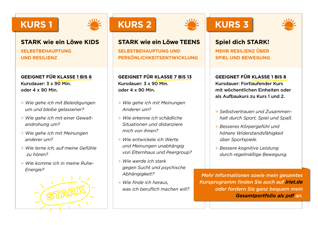 Du lernst, deine Grenzen klar zu zeigen, dich in schwierigen Situationen zu behaupten und dich selbst besser zu schützen. Mit coolen, praktischen Übungen trainierst du Mut, innere Stärke und einen respektvollen Umgang mit anderen – damit du sicherer und selbstbewusster durchs Leben gehst.